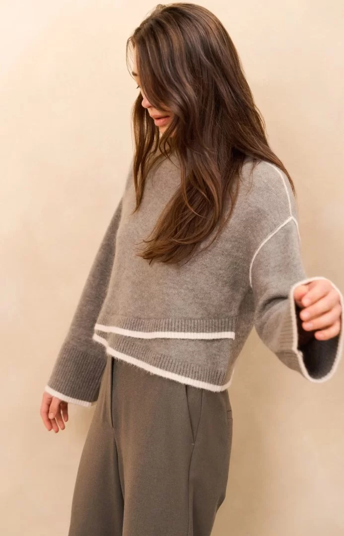 YAYA Knitted sweater with contrasting lines-Taupe Grey Melange