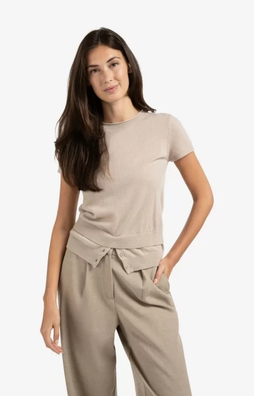 YAYA Knitted top with double hem and button details-Sand Melange