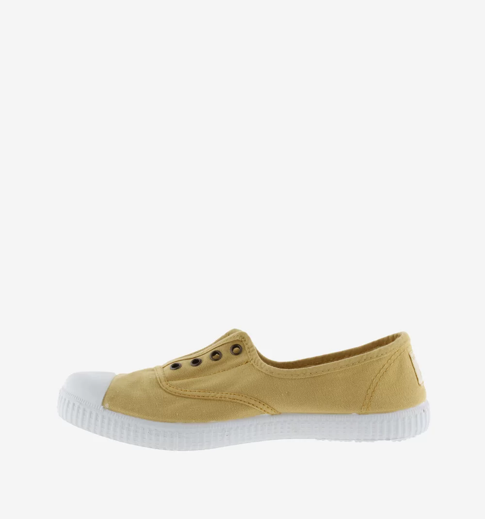Women’s slip-on canvas shoes made in a unique combination of DREC® (Dyeable Recycled Eco Cotton) and organic cotton cultivated, spun and woven in Spain. They represent a step towards sustainability. The vulcanised natural rubber sole provides durability, while the rubber reinforcement at the toe adds additional strength. The slip-on design is complemented by a soft stretch on the upper and includes a removable inner insole for greater comfort.